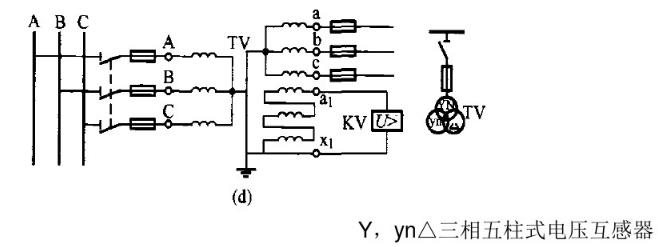 4.一臺三相五芯柱電壓互感器接成YN/YN/Δ(開口三角形),如圖1(d)所示。接成Y0形的二次線圈供電給儀表、繼電器及絕緣監(jiān)察電壓表等。輔助二次線圈接成開口三角形,供電給絕緣監(jiān)察電壓繼電器。當(dāng)三相系統(tǒng)正常工作時,三相電壓平衡,開口三角形兩端電壓為零。當(dāng)某一相接地時,開口三角形兩端出現(xiàn)零序電壓,使絕緣監(jiān)察電壓繼電器動作,發(fā)出信號。