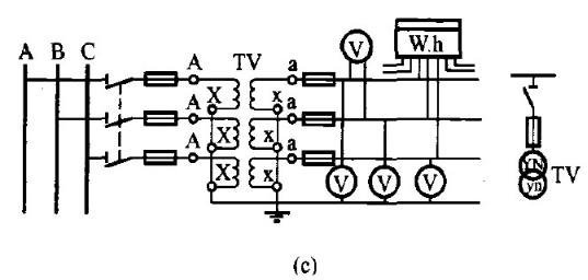 3.三個單相電壓互感器接成YN/YN形,如圖1(c)??晒┙o要求測量線電壓的儀表和繼電器,以及要求供給相電壓的絕緣監(jiān)察電壓表。